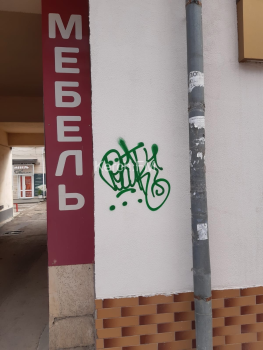 Видно, как молодой человек (пол не распознать) подходит к стене осматривается и наносит зеленую надпись. Всего их на улице появилось более 10 штук.