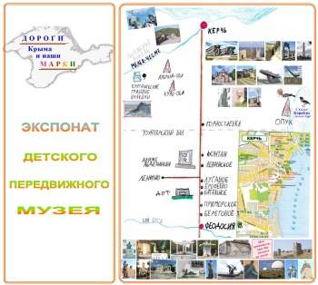 Второе - дороги Крыма и наши марки. (Детская рукопись) Марки - это напечатанные нами 120 достопримечательностей Крыма одинаковой высоты 2 сантиметра. Вдоль нарисованной линии дороги от Керчи до Севастополя наносятся населённые пункты с карты Крыма и наклеиваются вдоль дороги Марки .