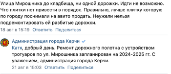 «Ремонт дорожного полотна с устройством тротуаров по ул. Мирошника запланирован на 2024-2025 гг. С уважением, администрация города Керчи».