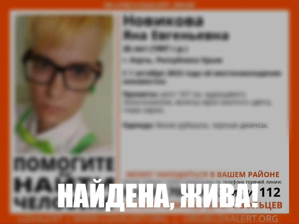 Волонтёры поискового отряда «Лиза Алерт» отыскали пропавшую 1 октября 27-летнюю Яну Новикову, - передает Керчь.ФМ.