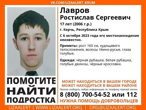 Волонтёры поискового отряда «Лиза Алерт» (Крым) в Керчи разыскивают 17-летнего Ростислава Лаврова, пропавшего в пятницу, 6 октября. Подросток - студент Керченского морского технического колледжа. Утром 6 октября вышел из общежития колледжа и не появился на учебе, - передает Керчь.ФМ.