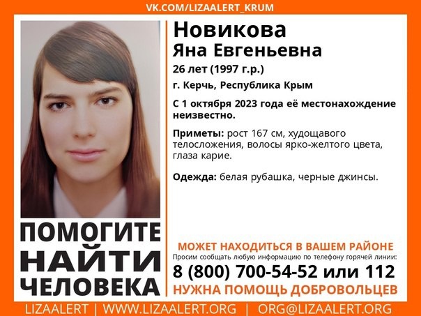 Несколькими днями ранее также пропала керчанка 26-летняя Яна Новикова. Последний раз ее видели 1 октября этого года.
