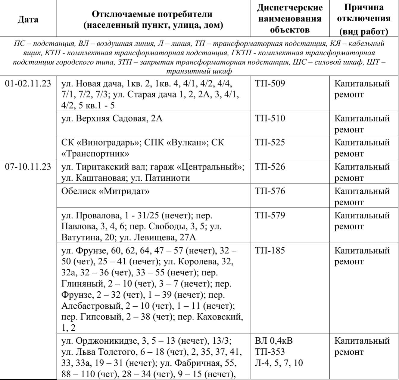 Керчанам сообщают график плановых отключений электроэнергии на ноябрь