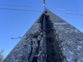 Это не единичный столб с такими дефектами. Через несколько метров, прямо рядом с пятиэтажкой, такой же инвалид.