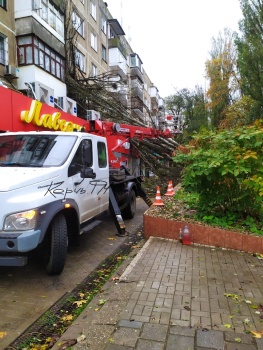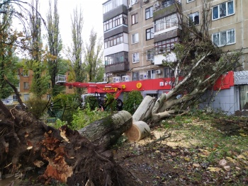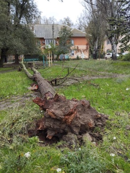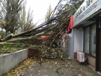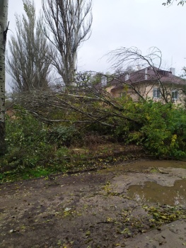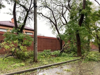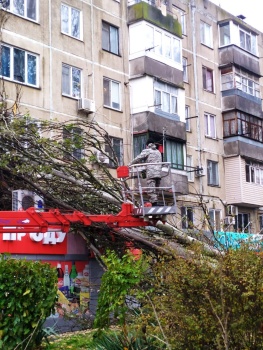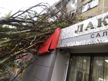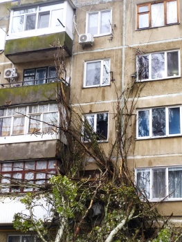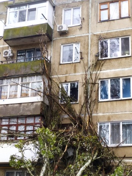 На Орджоникидзе огромный упавший на дом тополь разбил в квартирах окна и повредил вывески магазинов.