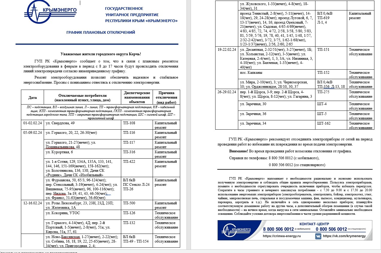 ГУП РК «Крымэнерго» предоставило графики плановых отключений в связи с ремонтными работами на февраль 2024 года. В следующем месяце будут капитальные ремонты сетей на Фурманова, Железняка, Горького, Свердлова, Курортной, Пошивальникова, - передает Керчь.ФМ.