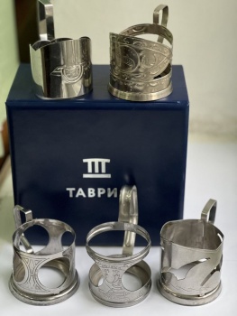 Три подстаканника Кольчугинского завода цветных металлов (РФСФР, Владимирская область, г. Кольчугино, 70-80 гг. ХХ в.); один подстаканник «Запорожье» (УССР, Вольняский завод имени Шевченко, 70-80 гг. ХХ в.); два подстаканника фирмы «Steelay» (Запорожье, ООО «Завод столовых приборов - ДСС», конец 90-х гг. ХХ в.), а также подарочный набор «Таврия» в футляре, состоящий из стакана, подстаканника и чайной ложки (Россия, Владимирская область, г. Кольчугино, завод «Кольчугинский мельхиор», начало XXI в.).