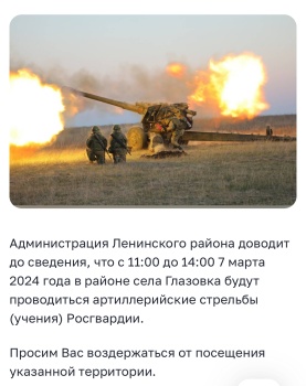 Администрация Ленинского района доводит до сведения, что с 11:00 до 14:00 7 марта 2024 года в районе села Глазовка будут проводить артиллерийские стрельбы (учения) Росгвардии. Об этом заранее сообщила пресс-служба муниципалитета на официальных страницах в Интернет, - передает Керчь.ФМ.