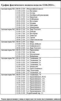 Керченский филиал приносит извинения за причиненные неудобства. Населению и предприятиям необходимо иметь запас питьевой воды на этот период времени. Водоканалом будет обеспечен подвоз питьевой воды специализированным транспортом, согласно графику и поступающим заявкам. Адреса нахождения специализированного транспорта могут корректироваться, согласно поступающим заявкам абонентов, информацию о местонахождении специализированного транспорта и заявку можно получить и оставить в диспетчерской службе.