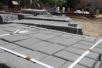 Рабочие устанавливают игровые элементы на детских площадках. Также на территории появились паллеты с тротуарной плиткой, которую в скором времени вымостят на пешеходных зонах.