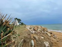 Надолго ли укрепит это сооружение песчаный берег от дальнейшего разрушения, увидим позже, но волны при прижимной волне доходят до обрыва, вымывая песок дальше.
