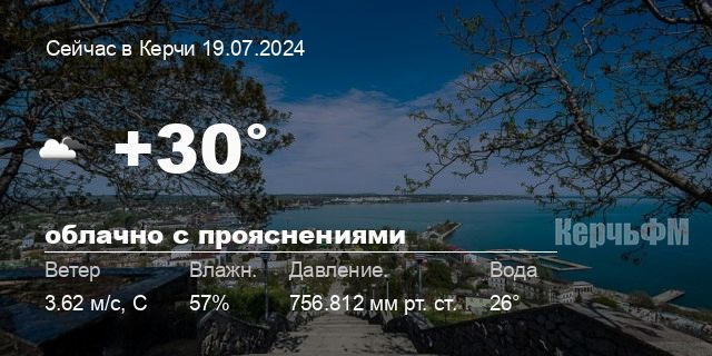 Сегодня днем в Керчи, 19 июля, ожидается малооблачная погода, температура воздуха от +27.5° до +32.4°С, ветер северный 5.47 м/с, порывы до 6.32 м/с, давление 755.3 мм рт. ст., влажность 44%.