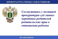 "Прокуратура Нахимовского района приняла участие в гражданском деле по иску департамента образования и науки города Севастополя о лишении родительских прав и взыскании алиментов", - говорится в сообщении.