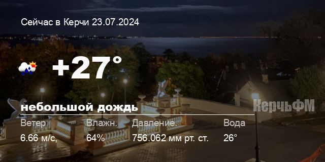 Сегодня днем в Керчи, 23 июля, ожидается небольшой дождь, температура воздуха от +24.7° до +27.4°С, ветер северный 5.81 м/с, порывы до 6.66 м/с, давление 756.1 мм рт. ст., влажность 65%.