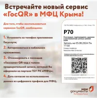 «ГосQR»- это уникальный пилотный проект Минцифры России, который позволит клиентам значительно сэкономить время при посещении МФЦ. Теперь данные из в цифрового профиля клиента будут автоматически передаваться в информационную систему центра «Мои Документы», исключая вероятность ошибок при заполнении заявок., передает КерчьФМ.