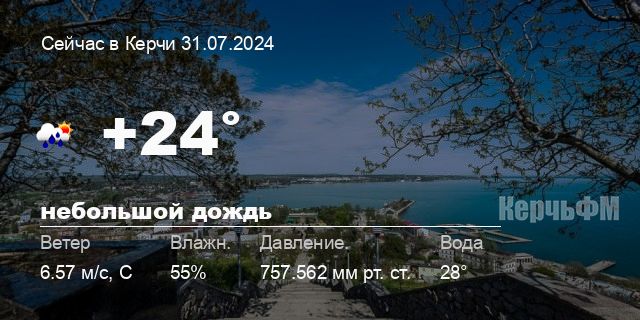 Сегодня днем в Керчи, 31 июля, ожидается небольшой дождь, температура воздуха от +22.6° до +26.6°С, ветер северный 6.02 м/с, порывы до 7.39 м/с, давление 758.3 мм рт. ст., влажность 48%.