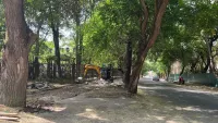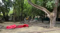 С одной стороны уже сняли плитку, её складывают в кучи.
