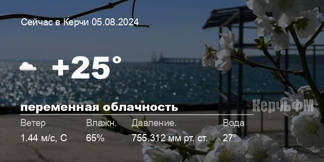 Сегодня днем в Керчи, 05 августа, ожидается небольшой дождь, температура воздуха от +23.1° до +26.4°С, ветер северный 1.52 м/с, порывы до 7.57 м/с, давление 755.3 мм рт. ст., влажность 62%.