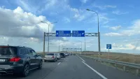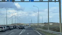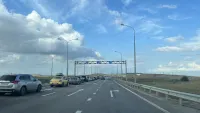 На выезд с полуострова хвост очереди около 9 километра. Со стороны Кубани от заправки Лукойл.
