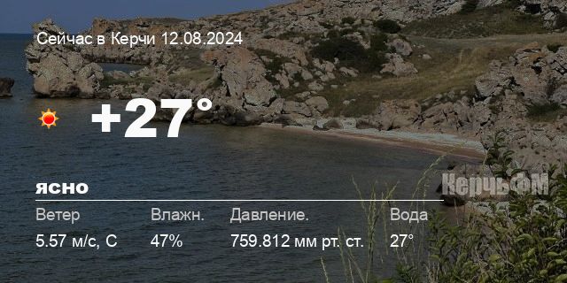 Сегодня днем в Керчи, 12 августа, ожидается ясная погода, температура воздуха от +25.2° до +28.3°С, ветер северный 6.28 м/с, порывы до 6.65 м/с, давление 759.1 мм рт. ст., влажность 41%.