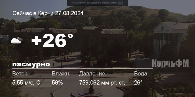 Сегодня днем в Керчи, 27 августа, ожидается пасмурная погода, температура воздуха от +23.9° до +27°С, ветер северный 5.48 м/с, порывы до 13.44 м/с, давление 758.3 мм рт. ст., влажность 60%.
