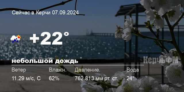 Сегодня днем в Керчи, 07 сентября, ожидается малооблачная погода, температура воздуха от +20.4° до +24.6°С, ветер северный 9.52 м/с, порывы до 13.34 м/с, давление 762.1 мм рт. ст., влажность 59%.
