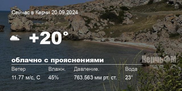 Сегодня днем в Керчи, 20 сентября, ожидается переменная облачность, температура воздуха от +19.4° до +21.7°С, ветер северный 10.62 м/с, порывы до 11.77 м/с, давление 763.6 мм рт. ст., влажность 44%.