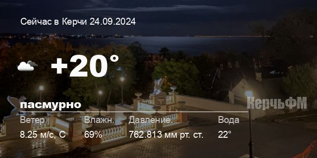Сегодня днем в Керчи, 24 сентября, ожидается пасмурная погода, температура воздуха от +18.1° до +21.4°С, ветер северный 5.74 м/с, порывы до 10.2 м/с, давление 762.8 мм рт. ст., влажность 68%.