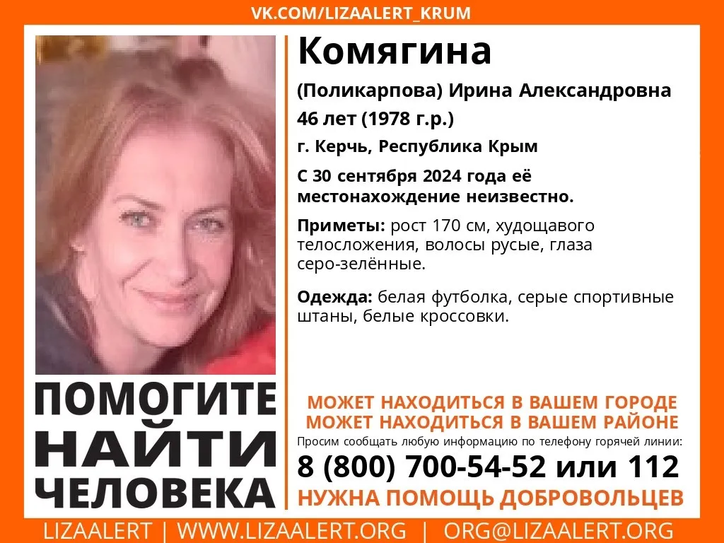 В Керчи разыскивают Комягину (Поликарпову) Ирину Александровну 46 лет (1978 г.р.). Информацию разместил поисковый отряд "Лиза Аллерт", - передает КерчьФМ.
