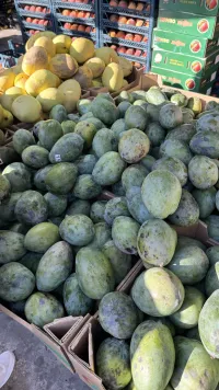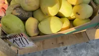 Если несколько недель продавали только манго со шкуркой зеленого цвета, то теперь появился и с желтой, ну и размером он больше, прям как маленькая дыня.