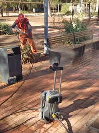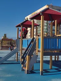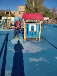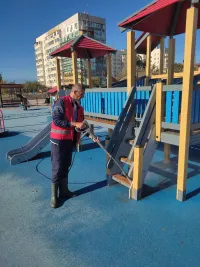 Рабочие подрядной организации ИП "Тубольцев" продолжают работы по очистке лавочек и элементов детских площадок от грязи и пыли.