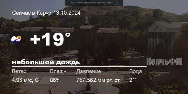 Сегодня днем в Керчи, 13 октября, ожидается небольшой дождь, температура воздуха от +16.7° до +20.6°С, ветер северный 9.24 м/с, давление 757.6 мм рт. ст., влажность 78%.