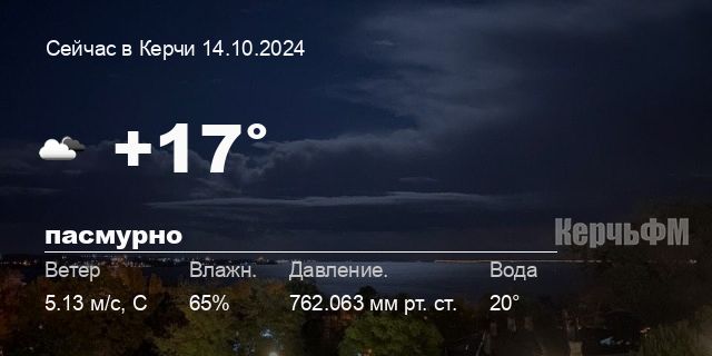 Сегодня днем в Керчи, 14 октября, ожидается пасмурная погода, температура воздуха от +16.3° до +18.1°С, ветер северный 3.23 м/с, порывы до 8.87 м/с, давление 762.8 мм рт. ст., влажность 55%.