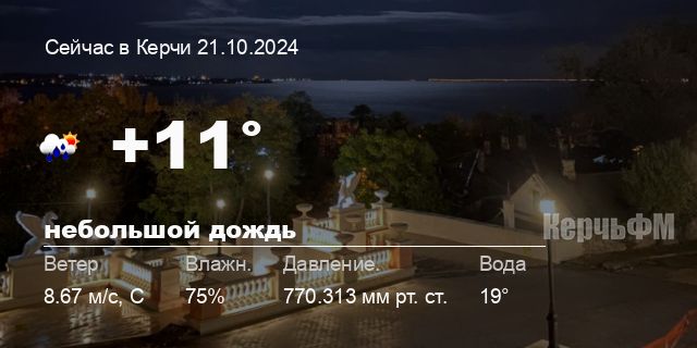 Сегодня днем в Керчи, 21 октября, ожидается небольшой дождь, температура воздуха от +10.4° до +12.5°С, ветер северный 9.14 м/с, порывы до 9.28 м/с, давление 770.3 мм рт. ст., влажность 75%.