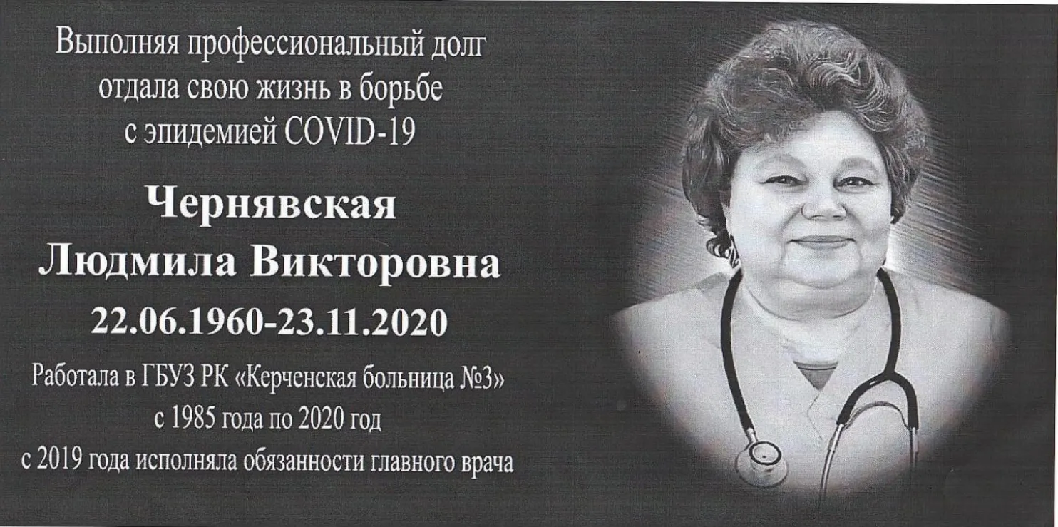 В Керчи установят мемориальную доску медицинскому работнику, отдавшему жизнь в борьбе с эпидемией COVID-19. Этим врачом являлась Чернявская Людмила Викторовна. Это решение приняли депутаты на сессии горсовета, - передает КерчьФМ.