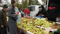 На ярмарке немного овощей, мясо, мед, саженцы растений, в большом ассортименте яблоки... И поют дошколята.