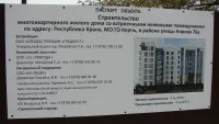 На заборе укрепили большой банер, где есть информация о застройщике, и о том, что здесь будет построен многоквартирный дом.