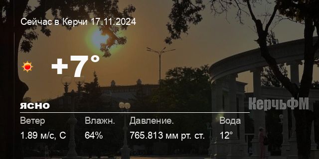Сегодня днем в Керчи, 17 ноября, ожидается ясная погода, температура воздуха от +5.3° до +9.5°С, ветер северный 1.98 м/с, порывы до 4.45 м/с, давление 764.3 мм рт. ст., влажность 61%.