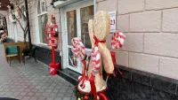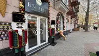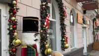 Уже некоторые предприниматели красиво украсили фасады зданий в новогодней тематике.