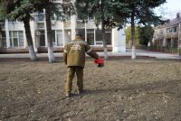 Сегодня сотрудники зеленхоза высадили 3 мешка газонной травы. В работе использовали рассеиватель, следом катком притрамбовывали семена. Для формирования ухоженного газона ранее почву подготовили к посеву, применив культиватор для перекопки и рыхления.