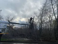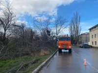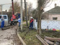 Сотрудники "Зеленхоза" обрезают ветви высокоствольных деревьев, представляющих угрозу электрическим проводам.