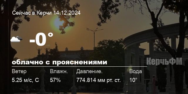 Сегодня днем в Керчи, 14 декабря, ожидается пасмурная погода, температура воздуха от -0.6° до +1.6°С, ветер северный 3 м/с, порывы до 9.73 м/с, давление 774.8 мм рт. ст., влажность 54%.