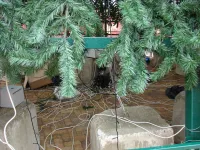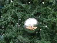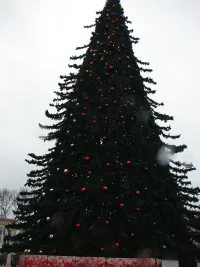 Сама елка уже украшена и гирляндой, и большими разноцветными игрушками в виде классических больших шаров.