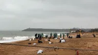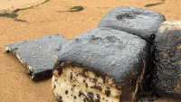 Собирают мазут с помощью лопат и грабель сразу в мешки, которые с пляжа вывозят.