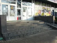 Поручни, помогающие людям при подъеме по скользким ступеням, по непонятным причинам убрали. Антитравматического покрытия на ступенях нет.