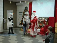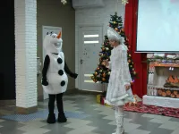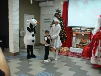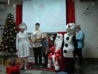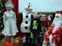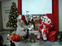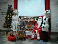 Снеговик, Снегурочка и Дед Мороз, который лично каждому вручил по два подарка, один из которых, конечно же, был сладким.