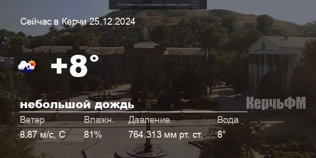 Сегодня днем в Керчи, 25 декабря, ожидается пасмурная погода, температура воздуха от +7.3° до +8.7°С, ветер северный 9.33 м/с, порывы до 10.78 м/с, давление 765.1 мм рт. ст., влажность 79%.