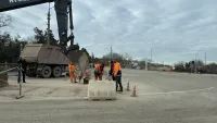 Место работ оградили и начинают поднимать асфальт. Проезд по одной полосе частично ограничен.
