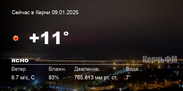 Сегодня днем в Керчи, 09 января, ожидается ясная погода, температура воздуха от +9.3° до +11.9°С, ветер северный 5.58 м/с, порывы до 8.74 м/с, давление 765.8 мм рт. ст., влажность 82%.