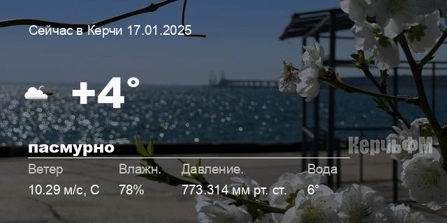Сегодня днем в Керчи, 17 января, ожидается пасмурная погода, температура воздуха от +2.9° до +5.6°С, ветер северный 8.75 м/с, порывы до 10.29 м/с, давление 771.8 мм рт. ст., влажность 74%.